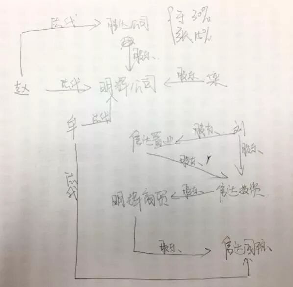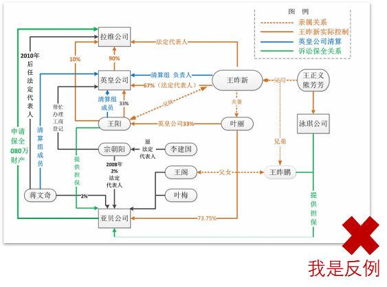 ▽ 插播一条反例:下图是新人特别容易犯的一个错误,对照这张图慢慢的理的确可以把全案所有的关系都讲清楚,但是这张图根本无法让人快速理清各种主体之间的关系,更看不明白到底想要表达怎样的意思,恐怕阅读者与其有时间研究这张迷宫图,还不如直接看看证据材料来得更为轻松。