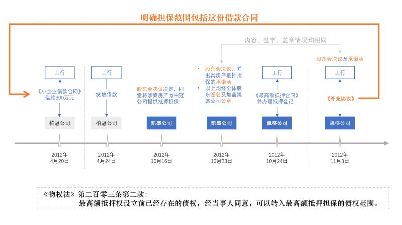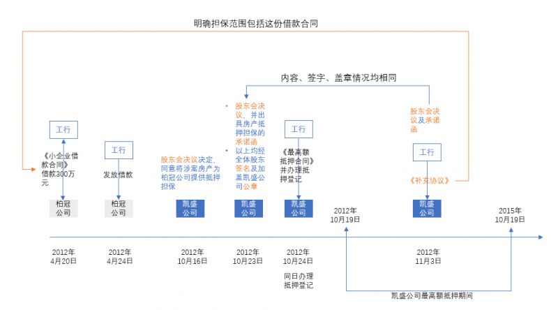 2012年10月16日,江苏凯盛置业有限公司(以下简称凯盛公司)股东会决议决定,同意将该公司位于江苏省宿迁市宿豫区江山大道118号-宿迁红星凯盛国际家居广场(房号:B-201、产权证号:宿豫字第201104767)房产,抵押与工行宣城龙首支行,用于亿荣达公司商户柏冠公司、闽航公司、航嘉公司、金亿达公司四户企业在工行宣城龙首支行办理融资抵押,因此产生一切经济纠纷均由凯盛公司承担。同年10月23日,凯盛公司向工行宣城龙首支行出具一份房产抵押担保的承诺函,同意以上述房产为上述四户企业在工行宣城龙首支行融资提供抵押担保,并承诺如该四户企业不能按期履行工行宣城龙首支行的债务,上述抵押物在处置后的价值又不足以偿还全部债务,凯盛公司同意用其他财产偿还剩余债务。该承诺函及上述股东会决议均经凯盛公司全体股东签名及加盖凯盛公司公章。2012年10月24日,工行宣城龙首支行与凯盛公司签订《最高额抵押合同》,约定凯盛公司以宿房权证宿豫字第201104767号房地产权证项下的商铺为自2012年10月19日至2015年10月19日期间,在4000万元的最高余额内,工行宣城龙首支行依据与柏冠公司、闽航公司、航嘉公司、金亿达公司签订的借款合同等主合同而享有对债务人的债权,无论该债权在上述期间届满时是否已到期,也无论该债权是否在最高额抵押权设立之前已经产生,提供抵押担保,担保的范围包括主债权本金、利息、实现债权的费用等。同日,双方对该抵押房产依法办理了抵押登记,工行宣城龙首支行取得宿房他证宿豫第201204387号房地产他项权证。2012年11月3日,凯盛公司再次经过股东会决议,并同时向工行宣城龙首支行出具房产抵押承诺函,股东会决议与承诺函的内容及签名盖章均与前述相同。当日,凯盛公司与工行宣城龙首支行签订《补充协议》,明确双方签订的《最高额抵押合同》担保范围包括2012年4月20日工行宣城龙首支行与柏冠公司、闽航公司、航嘉公司和金亿达公司签订的四份贷款合同项下的债权。