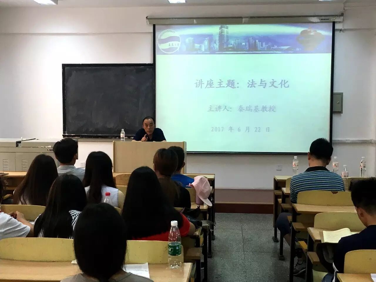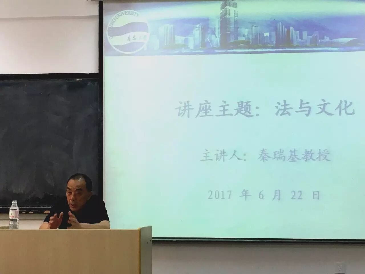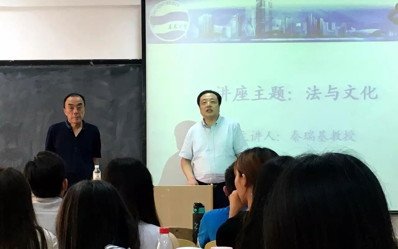 聘任仪式结束后,秦瑞基教授在青大博学楼面向全体法学院本科生、研究生作了题为《文化与法》的学术报告,法学院董和平院长、李瑞生教授、丁燕副教授等部分领导、老师出席报告会。